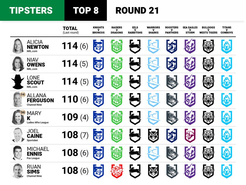 Nrl Tipping - See who our nrl experts are tipping to win in round 1.. If tipster's join or create a tipping comp after the footy season has commenced they will be allocated the default score of the tipping competition ie away team . Need a hand with your tips this week? Put in your nrl and afl . Free to enter and play. Get you tips in, monitor your success .